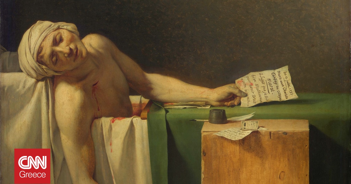 Πάνω από δύο αιώνες μετά, στεκόμαστε μπροστά στο έργο και βλέπουμε έναν νεκρό επαναστάτη στην μπανιέρα του. Τον Ζαν-Πολ Μαρά, τον φλογερό δημοσιογράφο της Γαλλικής Επανάστασης, δολοφονημένο στις 13 Ιουλίου 1793 από τη Σαρλότ Κορντέ. Ένας άνδρας γέρνει μπροστά μας, σωριασμένος, με μια πένα στο δεξί χέρι και ένα γράμμα στο αριστερό. Φαινομενικά, τίποτε πιο απλό — τίποτε πιο σιωπηλό.